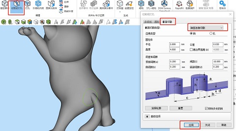 ③打開切割功能,選擇截面切割,右側可有多模式,基本模式下即直接切割開,其中高級模式下會產生可嵌合的中央凸臺,凸臺結合適用于中空模型的切割,銷型切割將在切割面上產生數個插銷,在案例中我們選擇高級模式,并依據切割面大小設置參數。