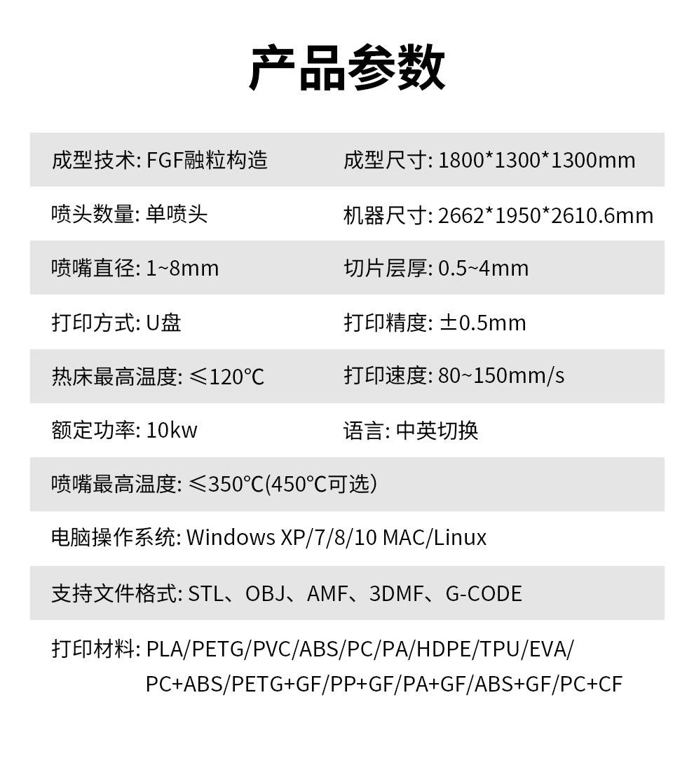 1.8米的超大打印尺寸,適配多種顆粒料耗材,具備更強大的塑造能力